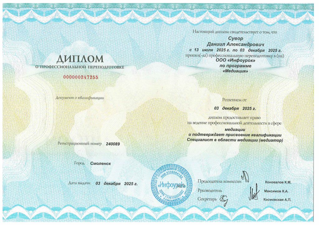 В 2024 году прошел курс профессиональной переподготовки в КЦЭТ и получил квалификацию юриста. Также проходил несколько курсов повышения квалификации в разных учебных центрах. Изучал законодательство Филиппин. Нашел местных партнеров, имеющих лицензию юриста на Филиппинах. Таким образом, могу предоставлять консультативные и медиативные услуги как в России, так и на Филиппинах.